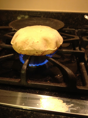 The reason I chose to write about ‘Roti’ is that it is one of the easiest and the toughest breads to make. Let me explain that, it is pretty easy as its made fresh at each meal and more often than not the dough is made fresh too but sometimes the dough is made for a couple of meals at a time and stored in refrigerator. Dough is nothing but flour and water mixed together, no yeast, no oil, no egg, nada. Make small balls and roll it out, a couple of minutes on the tava (flat, no edge skillet) and then pouf it up on direct fire.